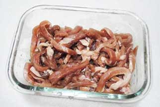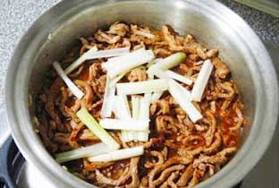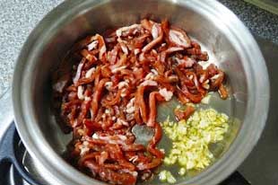 肉絲八分熟(表層白色)時(shí)放入蒜末翻炒,然后放入豆辦醬與砂糖翻炒上色。