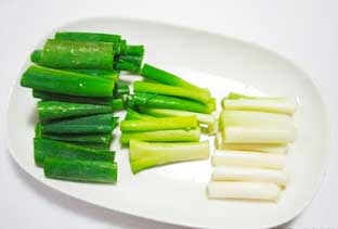 章丘大蔥洗凈切段,蔥白段從中間切開(kāi),蔥白與蔥葉分開(kāi)放(長(zhǎng)度與肉絲相近)。蒜瓣切末備用。